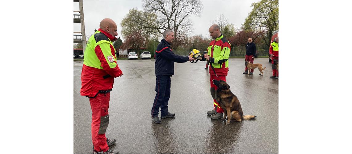 À l’issue de l’exercice, le Lieutenant-colonel Patrice Petit, sous-directeur chargé de la prévention, la prévision et des opérations a remis le casque de chef d’unité au sergent David Prost, suite à la validation de sa formation CYN 2 avec son chien Ryder.